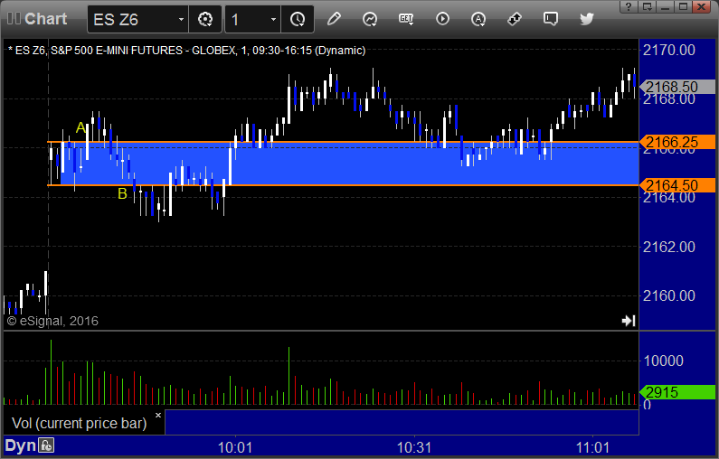 ES Opening Range Play triggered long at A and stopped, we used the midpoint, triggered short at B and stopped: