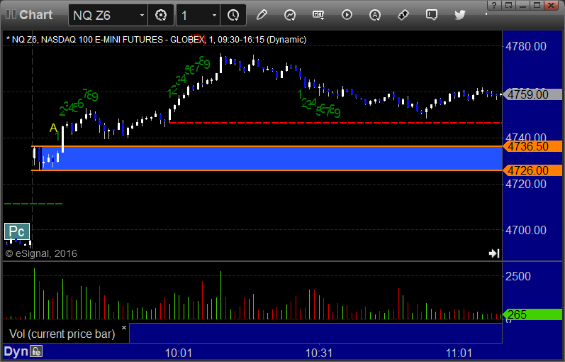 NQ Opening Range Play triggered long at A and would have worked, but we past on it because the trigger was 10 points above the ORH: