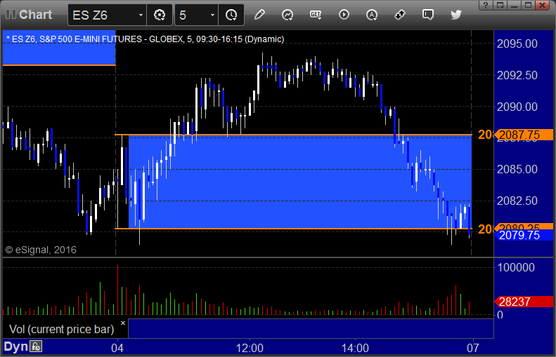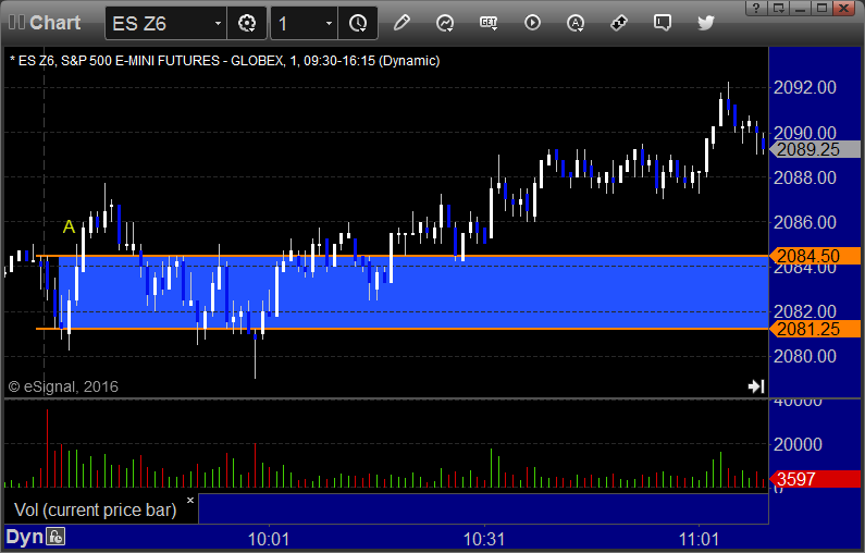 ES Opening Range Play triggered long at A and I posted a close at 2083.50 instead of waiting for the full stop out because the markets had stalled at the NQ gap fill: