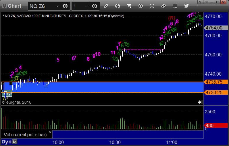 NQ Opening Range Play triggered short at A and stopped, triggered long at B and worked: