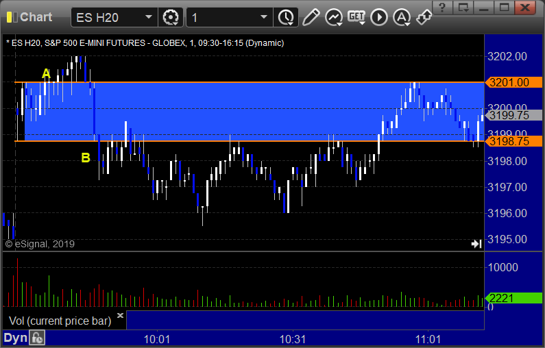 ES Opening Range Play triggered long at A and stopped, triggered short at B and worked: