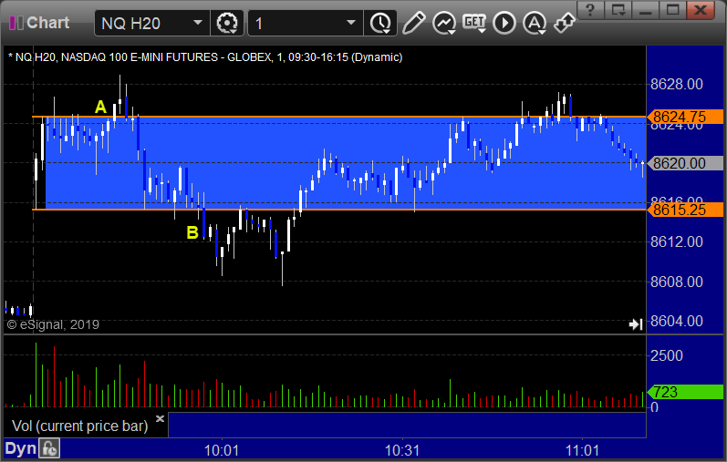 NQ Opening Range Play triggered long at A and stopped under the midpoint, triggered short at B and worked enough for a partial: