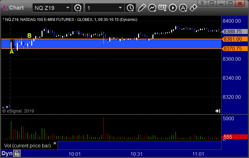 NQ Opening Range Play triggered short at A and stopped over the midpoint, triggered long at B and worked: