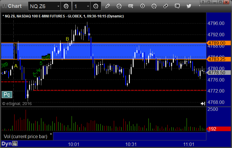 NQ Opening Range Play triggered short at A and worked, triggered long at B and worked enough for a partial: