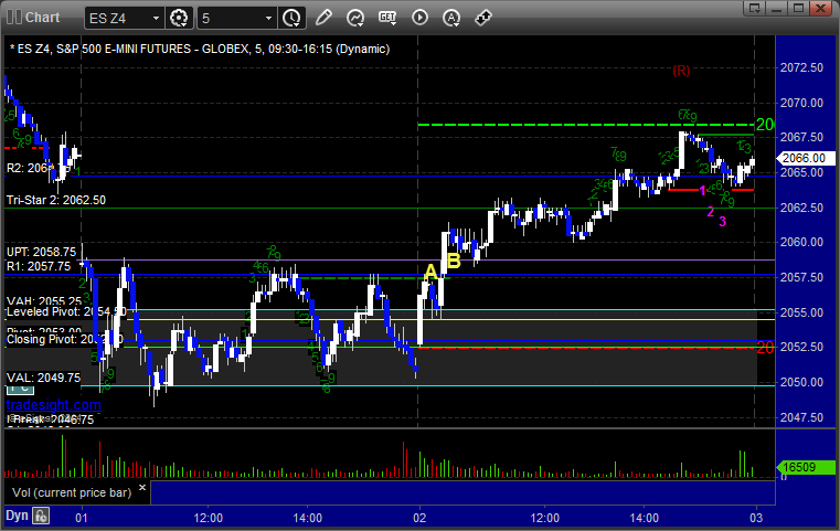 Mark’s call triggered long at A at 2058.00, hit first target for 6 ticks, and raised the stop and stopped at 2059.25. My call triggered long over UPT at B at 2059.00, hit first target for 6 ticks, and I closed the second half at 2060.00: