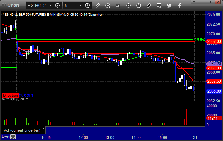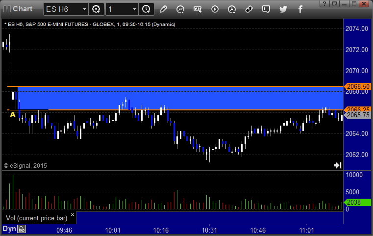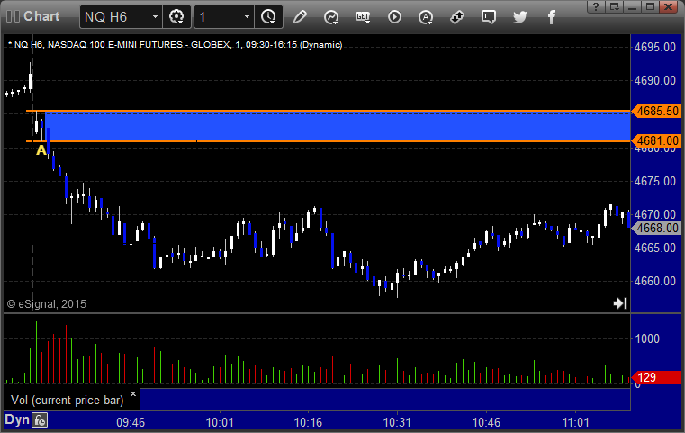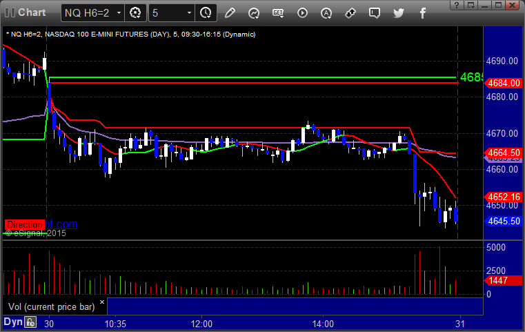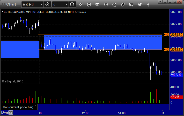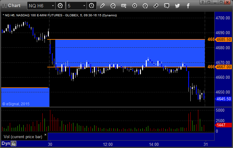 The markets gapped down and pushed a little lower out of the gate, giving us nice opening range plays. We then went flat for hours until the last three minutes of the day, where we pushed a little lower on 1.1 billion NASDAQ shares. No need for trades outside of the Opening Range plays in this volume.