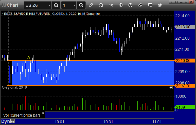 ES Opening Range Play triggered long at A but I posted to close for 5 tick loss after it was taking too long to do anything and the NASDAQ side printed lows (would have worked some if kept):