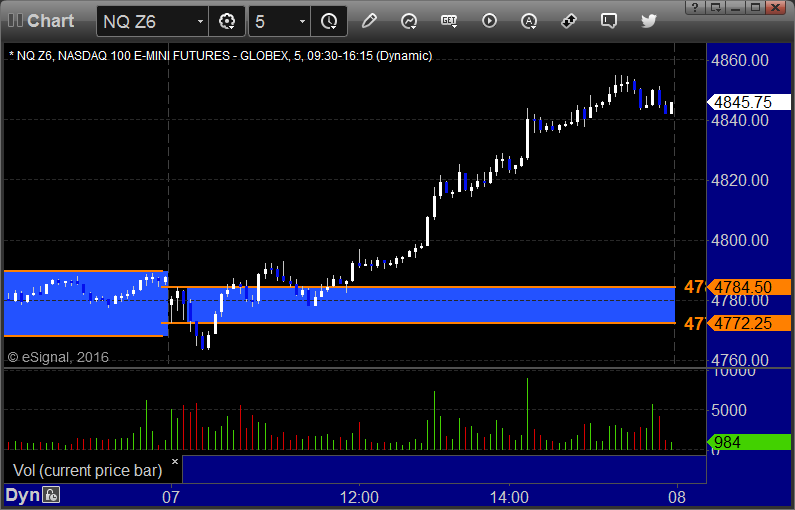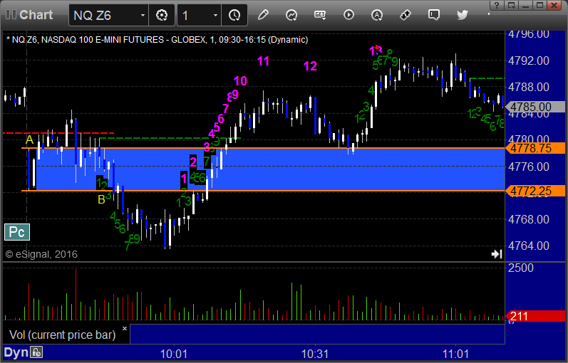 NQ Opening Range Play triggered long at A and worked, triggered short at B and worked, although we won’t count the short since we were long the ES and this wasn’t into the gap: