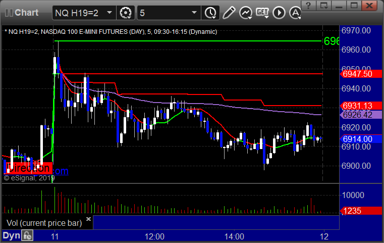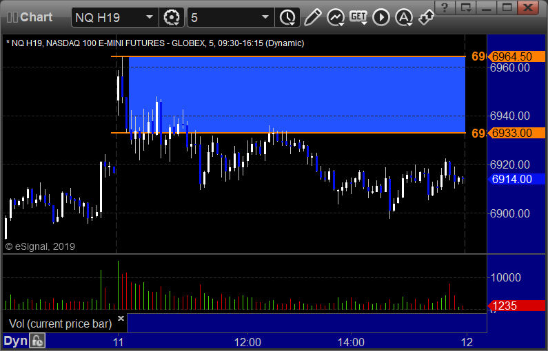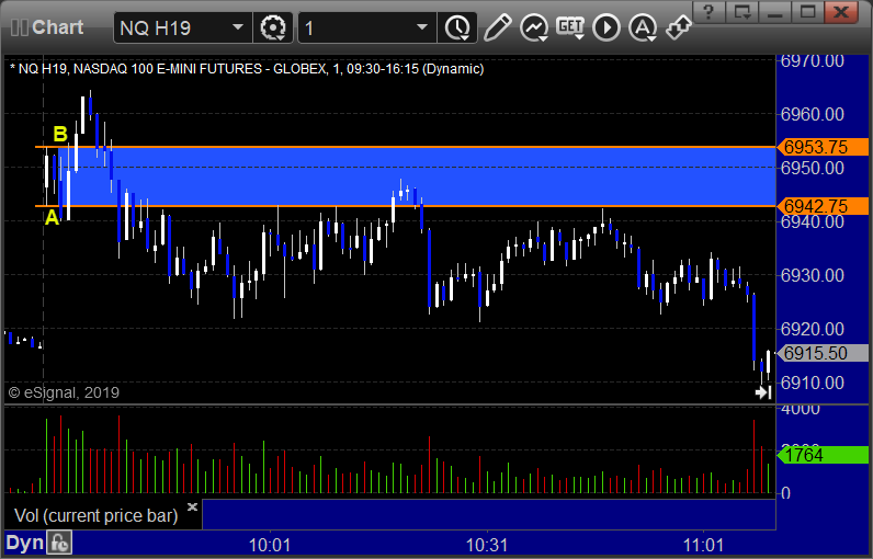 NQ Opening Range Play triggered short at A and stopped, triggered long at B and worked enough for a partial: