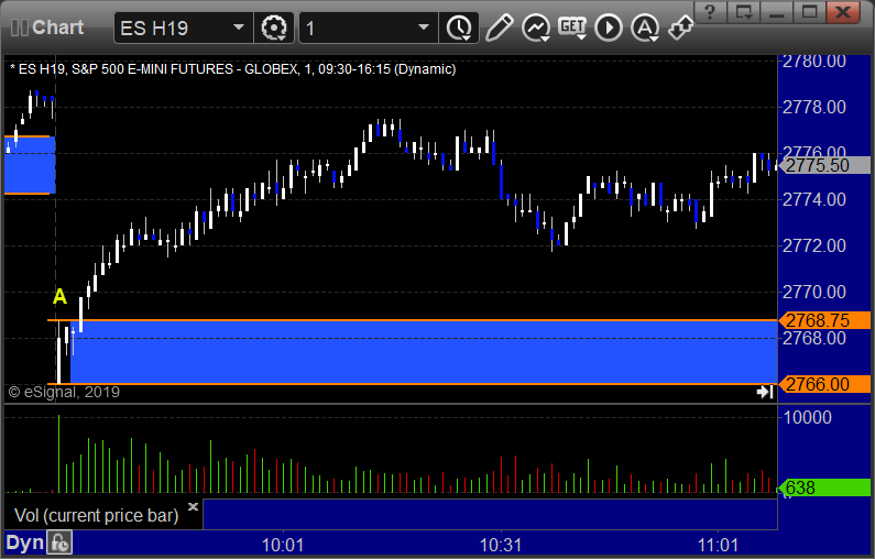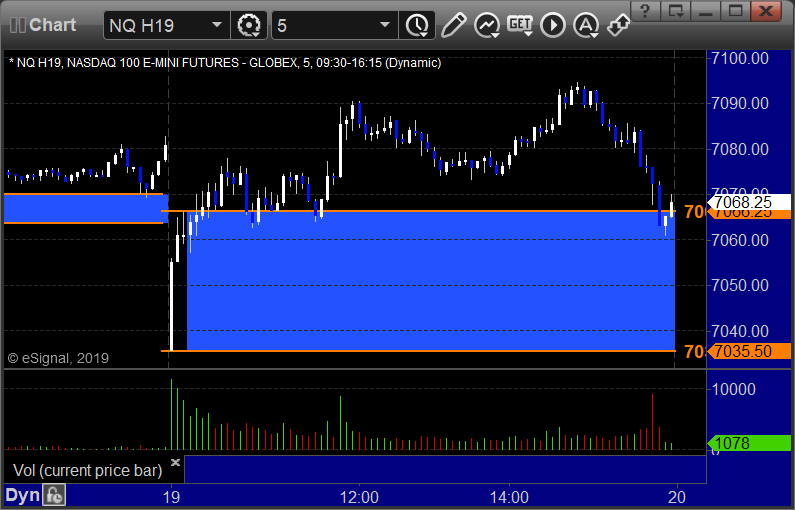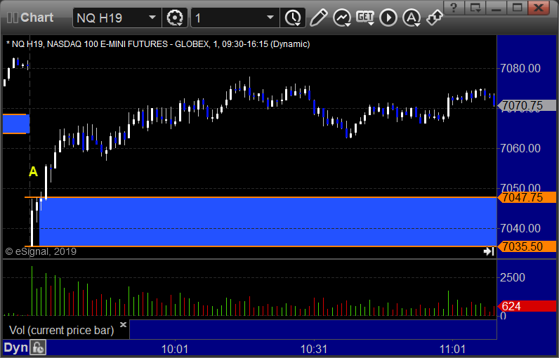 NQ Opening Range Play triggered long at A and would have worked, but too far out of range to take: