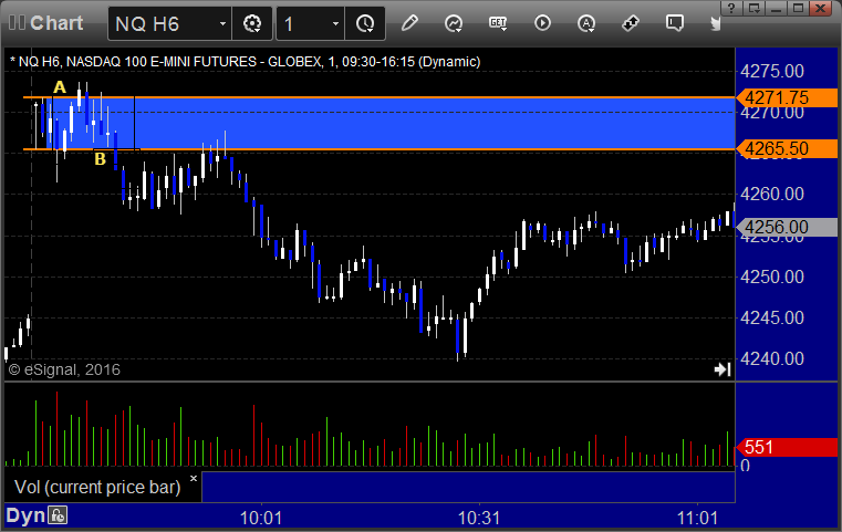 NQ Opening Range Play, now here’s an important lesson. The long trigger at A we don’t take because we were short the ES at the time. If I make exceptions to that, I state it in the Lab, but the only time I do is usually if the first trade to trigger is away from the gap and the second is into the gap. Also, in this case, that candle on the NQ 1 minute was exactly a Comber 13 sell signal. Triggered short at B and worked: