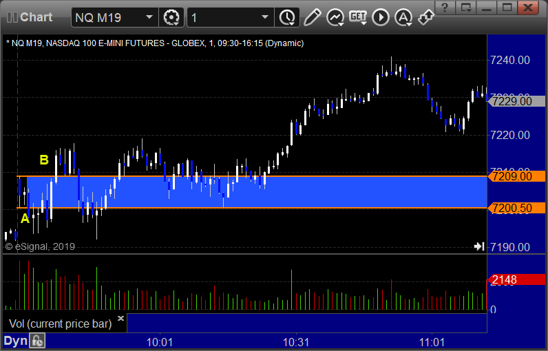 NQ Opening Range Play triggered short at A and worked enough for a partial, triggered long at B and stopped under the midpoint: