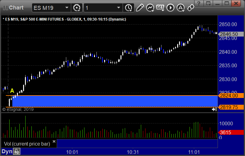 My call triggered long at A at 2838.75 and stopped immediately, so we put it back in and triggered 10 minutes later at B, hit first target for 6 ticks, and raised the stop a couple of times and stopped 48 ticks in the money: