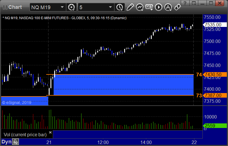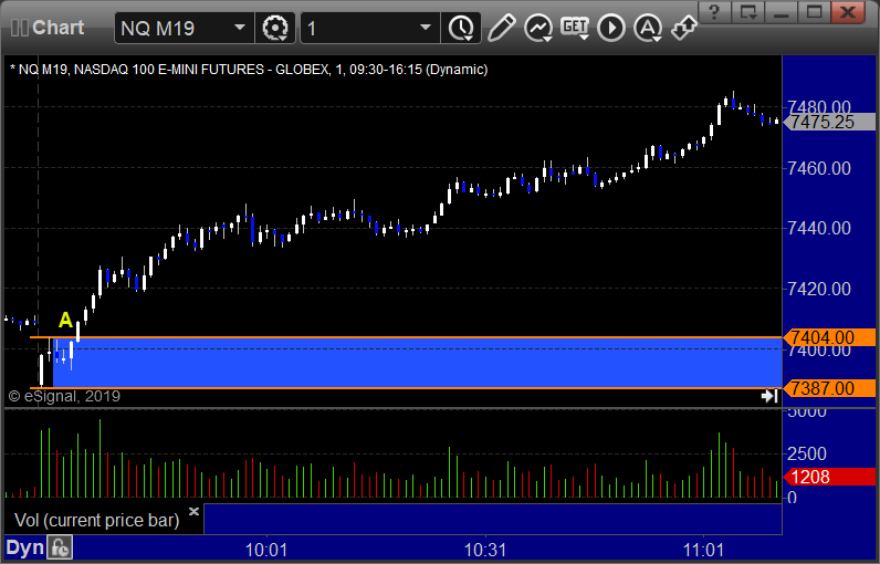 NQ Opening Range Play triggered long at A and would have worked but triggered too far out of range to take: