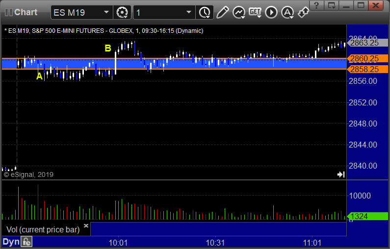 ES Opening Range Play triggered short at A and stopped, triggered long at B and worked: