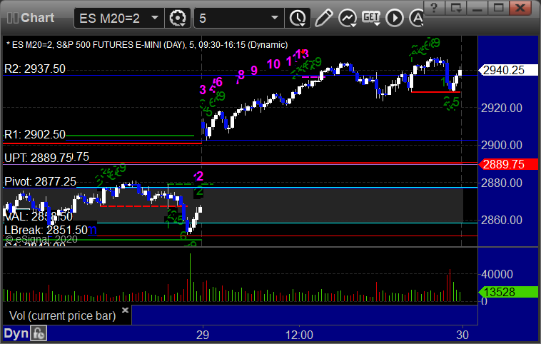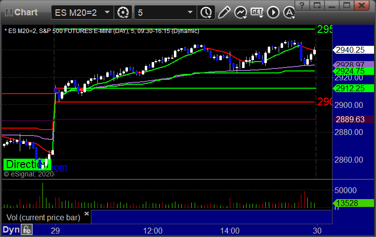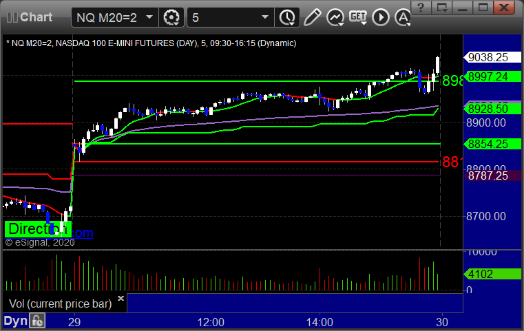 As usual, let’s start by taking a look at the ES and NQ with our market directional lines, VWAP, and Comber on the 5-minute chart from today’s session: