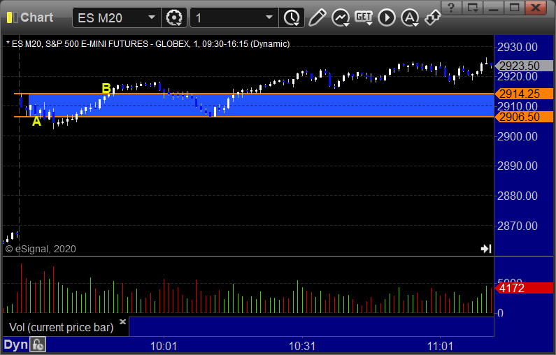 ES Opening Range Play triggered short at A and worked enough for a partial, triggered long at B but too far out of range to take: