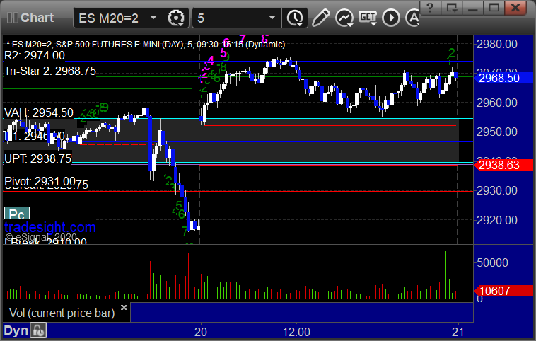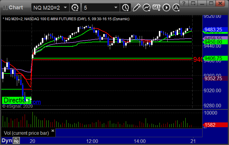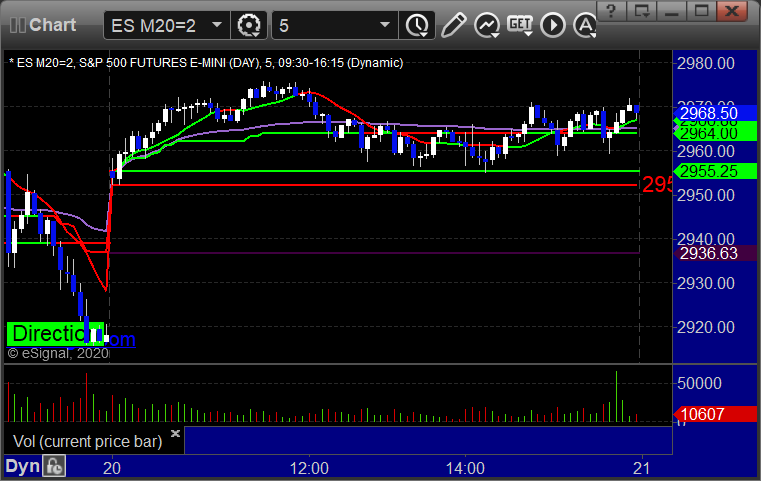 As usual, let’s start by taking a look at the ES and NQ with our market directional lines, VWAP, and Comber on the 5-minute chart from today’s session: