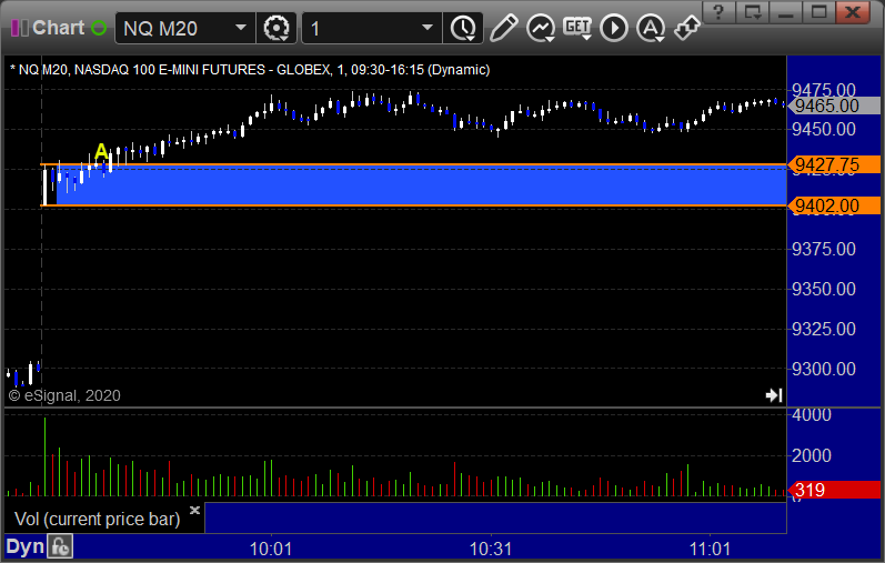 NQ Opening Range Play triggered long at A but too far out of range to take: