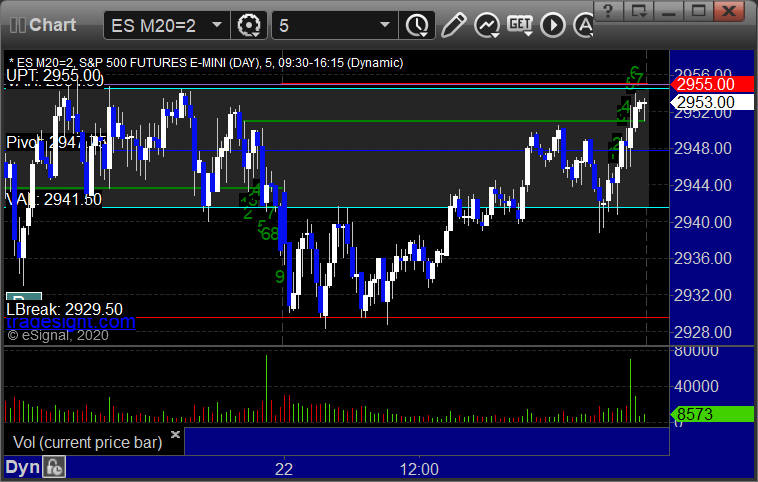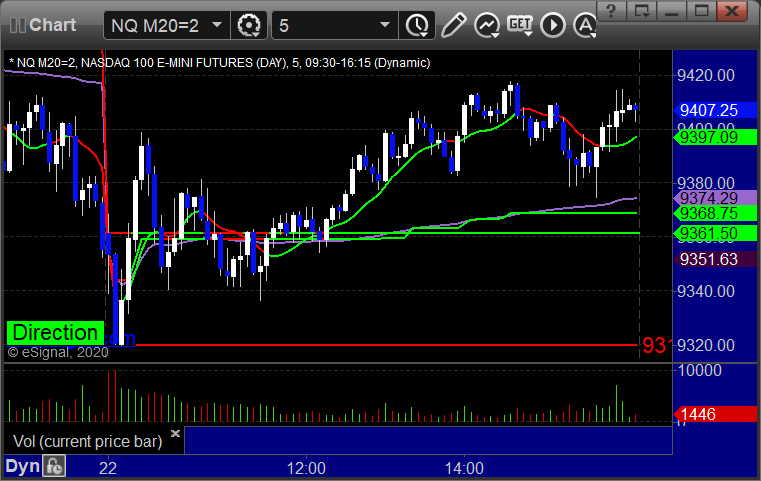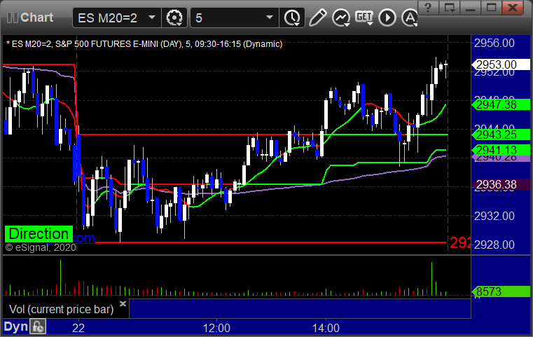 As usual, let’s start by taking a look at the ES and NQ with our market directional lines, VWAP, and Comber on the 5-minute chart from today’s session: