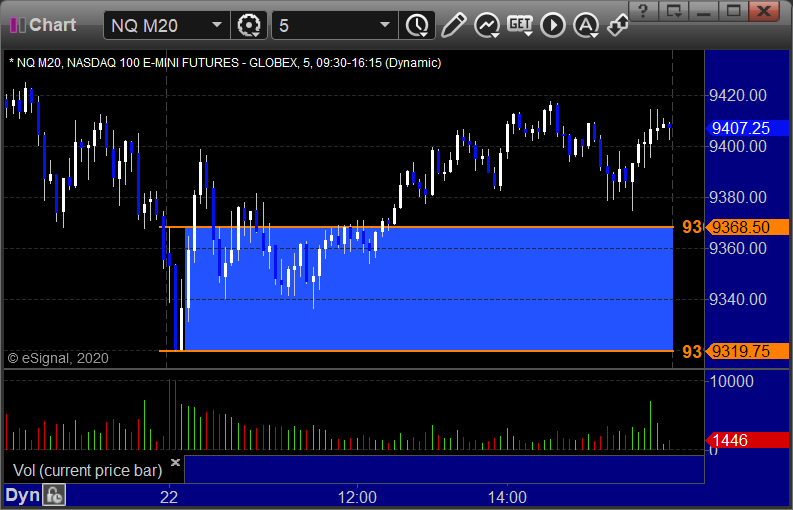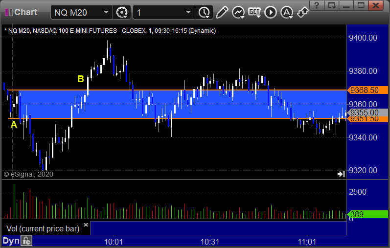 NQ Opening Range Play triggered short at A and long at B but both were too far out of range to take: