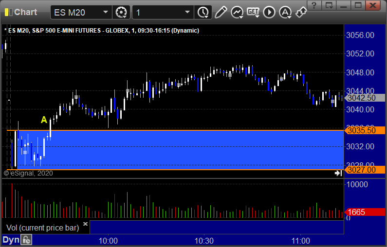 ES Opening Range Play triggered long at A but too far out of range to take: