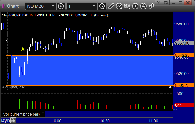 NQ Opening Range Play triggered long at A but too far out of range to take: