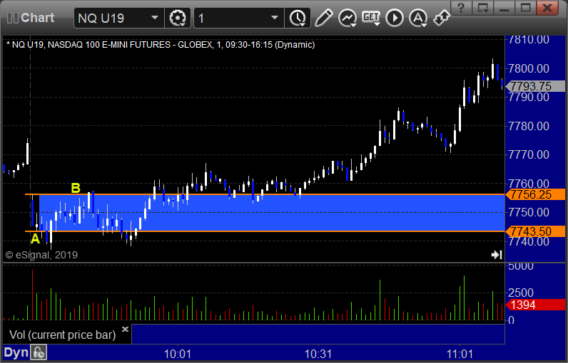 NQ Opening Range Play triggered short at A but too far out of range to take, triggered long at B and stopped under the midpoint: