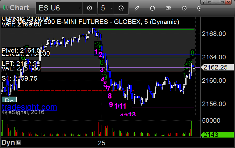 The markets opened close to flat and went lower, although the broad market moved more than the NASDAQ (ES range was still only 10 points) and then after 90 minutes, we got a Comber 13 buy signal and that was the low on the ES. The rest of the day was a drift on 1.6 billion NASDAQ shares, as most of the week will be with earnings, a key summer vacation week, and a 2-day Fed meeting.