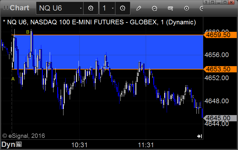 NQ Opening Range Play triggered short at A and didn’t work, triggered long at B but should not have been taken since we were short ES and this was not into a gap: