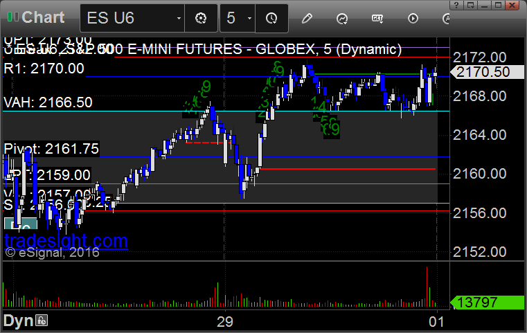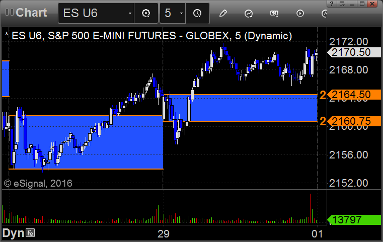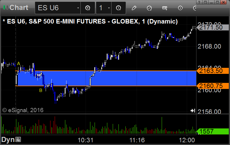 ES Opening Range Play triggered long at A and I closed it at 2162.50 per the Twitter feed, triggered short at B and worked enough for a partial: