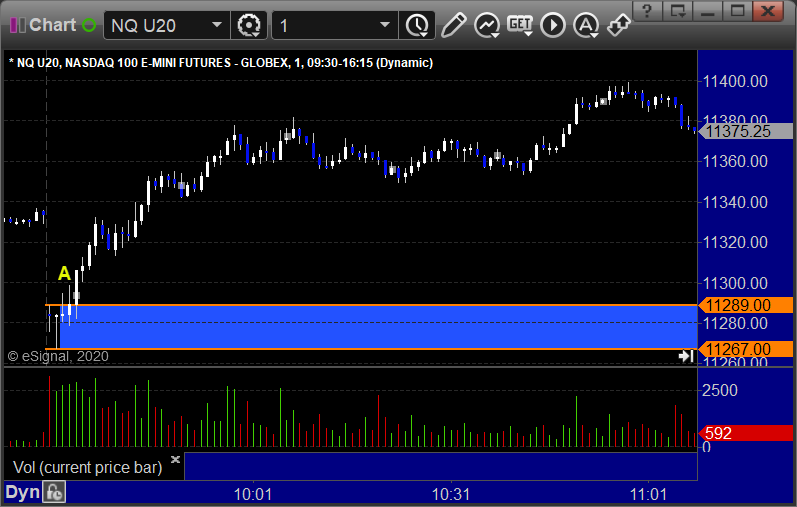 NQ Opening Range Play triggered long at A but too far out of range to take: