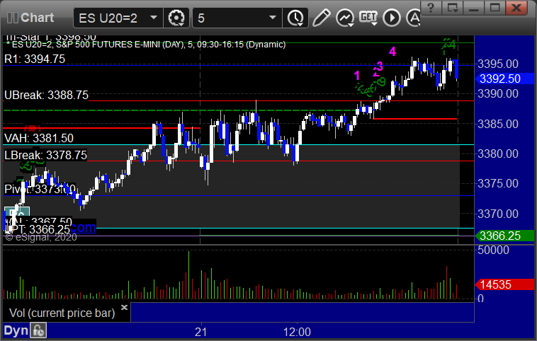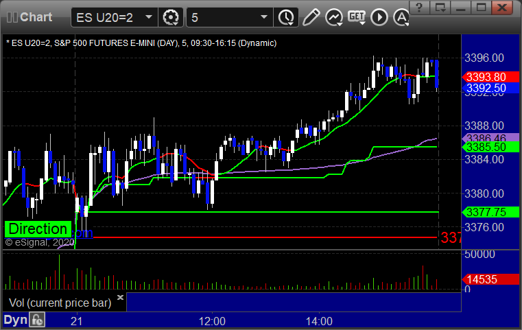As usual, let’s start by taking a look at the ES and NQ with our market directional lines, VWAP, and Comber on the 5-minute chart from today’s session: