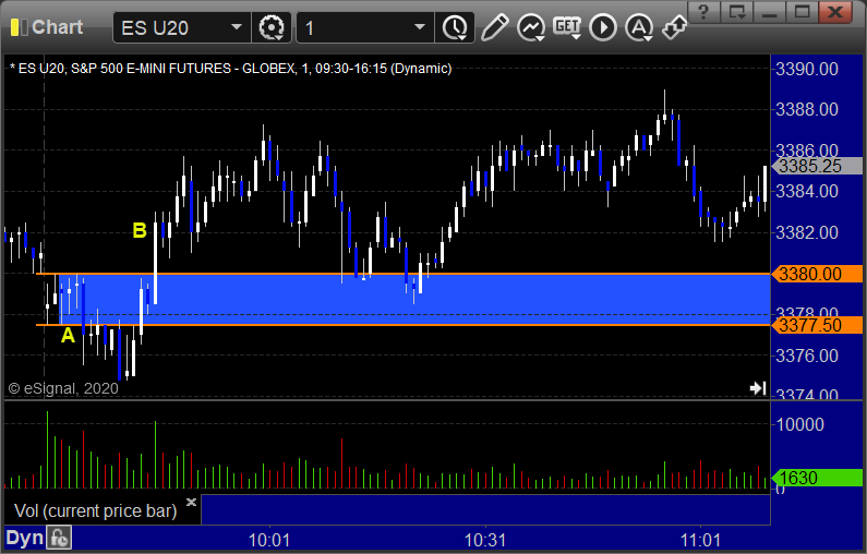ES Opening Range Play triggered short at A and worked enough for a partial, triggered long at B and worked enough for a partial: