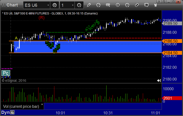 ES Opening Range Play triggered long at A but I closed for a 2-tick loss after 30 painful minutes of nothing happening: