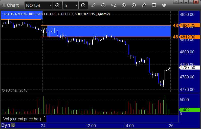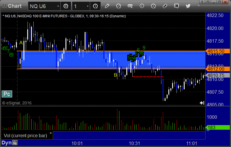 NQ Opening Range Play triggered long at A, missed the first official target by half a tick, triggered short at B and I ended up closing it for 3 ticks out of boredom:
