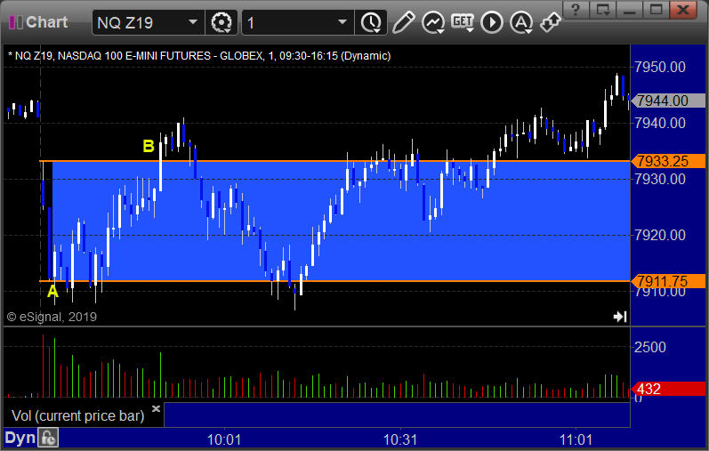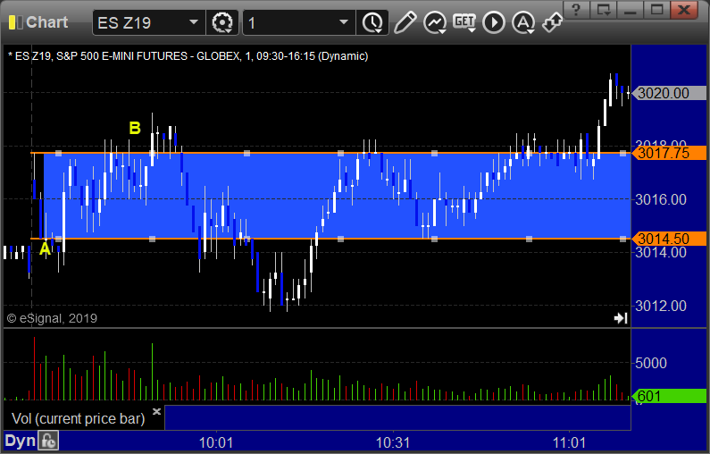 ES Opening Range Play triggered short at A and stopped over the midpoint, triggered long at B and stopped: