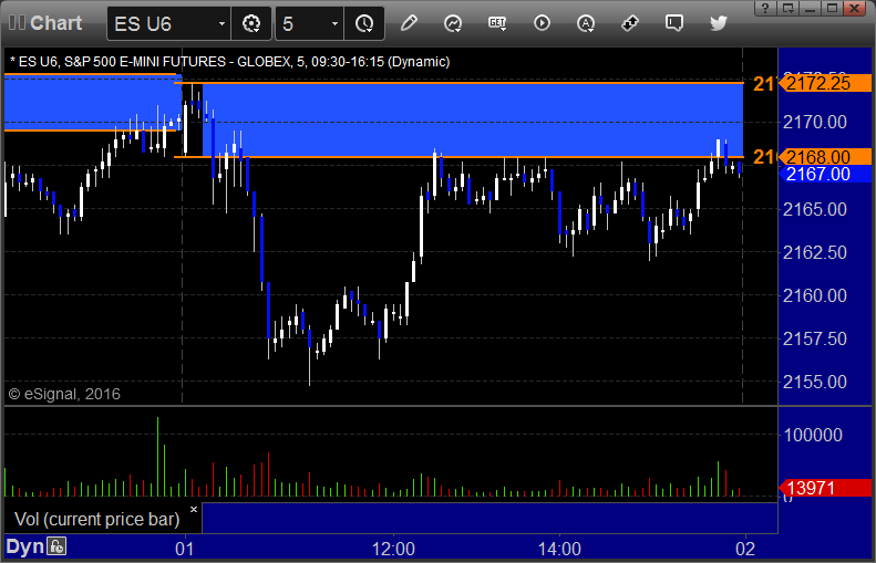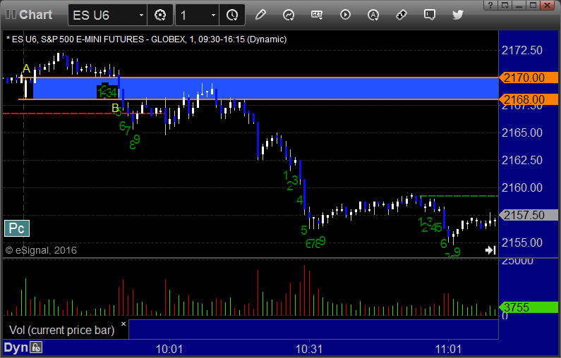ES Opening Range Play triggered long at A and stopped, unfortunately, then triggered short at B and worked enough for a partial: