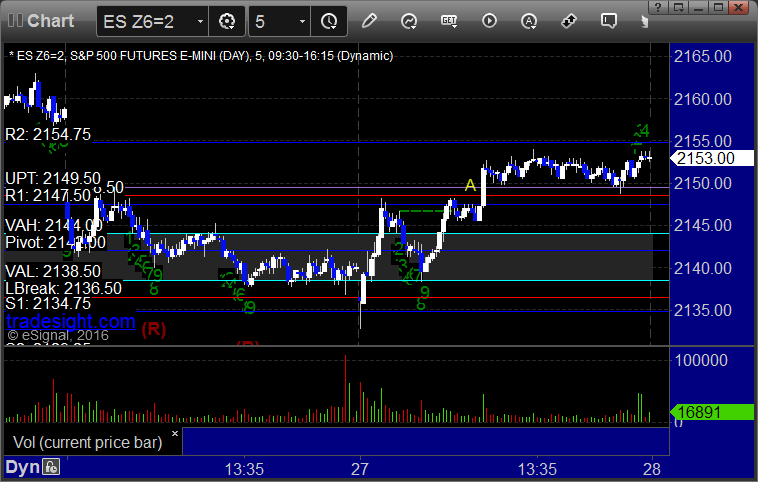 My call triggered long at A at 2149.75, hit first target for 6 ticks, and after adjusting the stop, the second half stopped 8 ticks in the money: