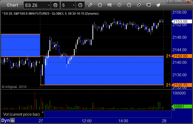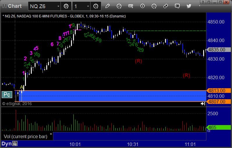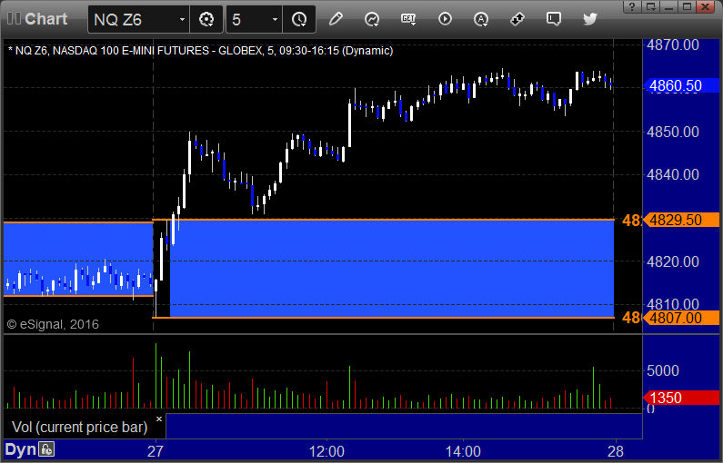 The markets gapped down small and headed up, establishing the range for the day mostly by lunch and going flat in the afternoon on 1.6 billion NASDAQ shares. We had a nice day in futures. See the ES and Opening Range sections below.