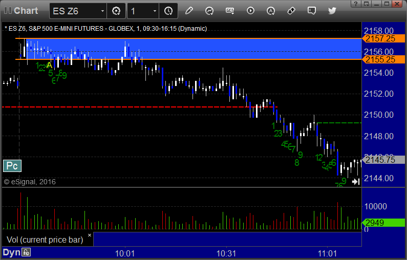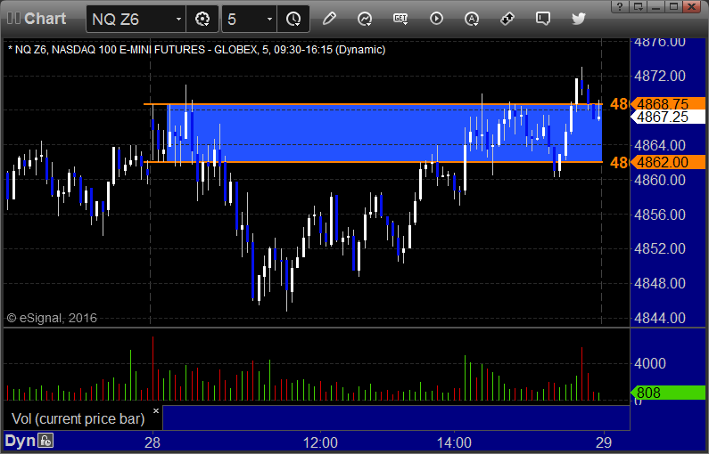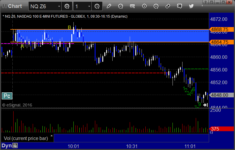 NQ Opening Range Play triggered short at A and stopped. The long at B was not valid because we were still short ES and it was not in the direction of the gap: