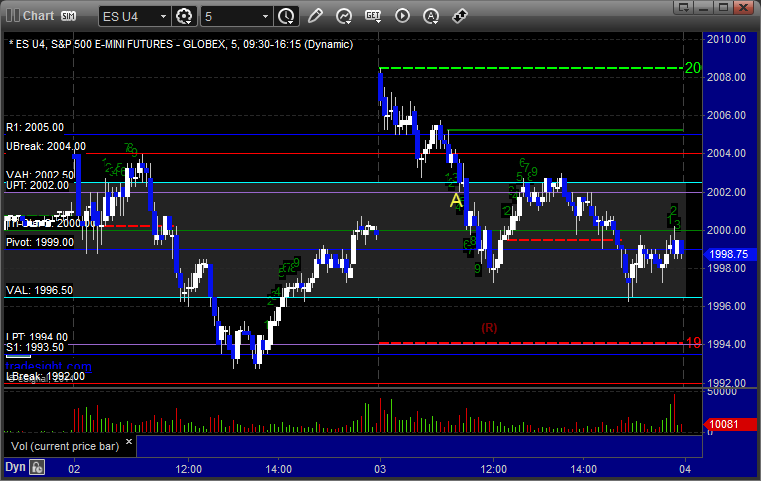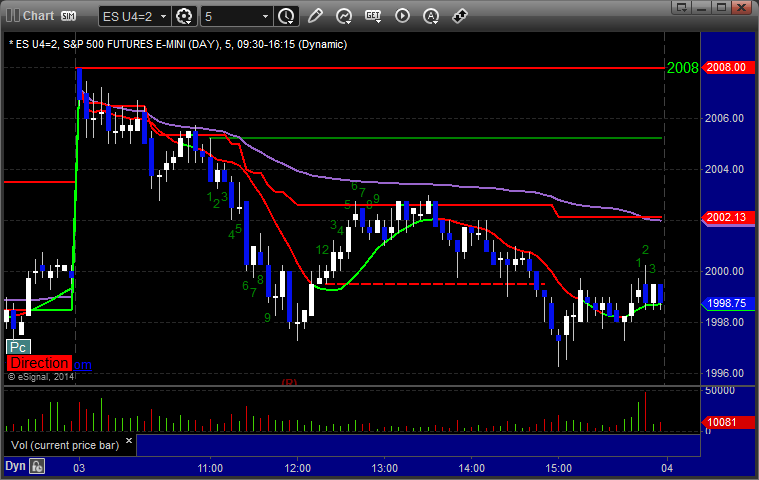 Triggered short at A at 2001.75, hit first target for 6 ticks, lowered stop twice and also stopped 6 ticks in the money: