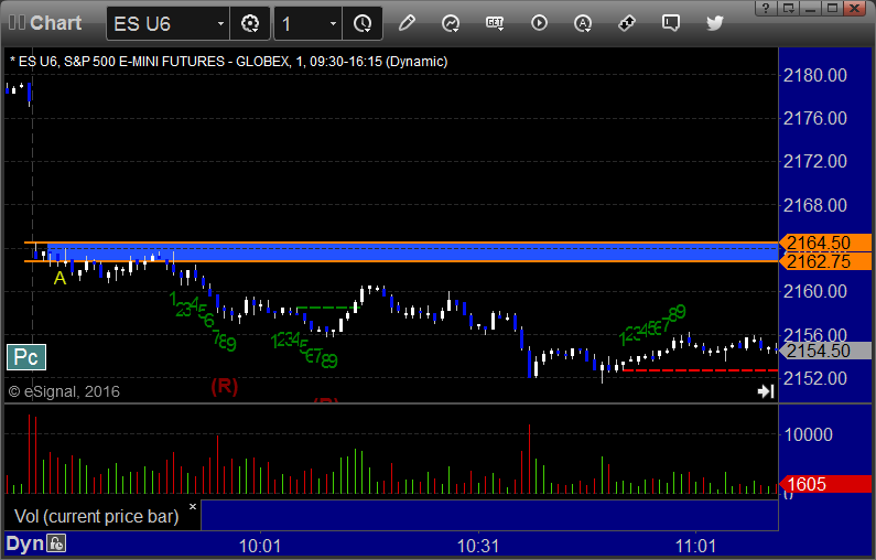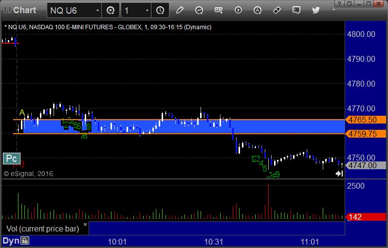 ES Opening Range Play technically triggered short at A and worked, but sticking with the hard and fast rules, you wouldn’t take this because you were already long the NQ and this was not into the gap: