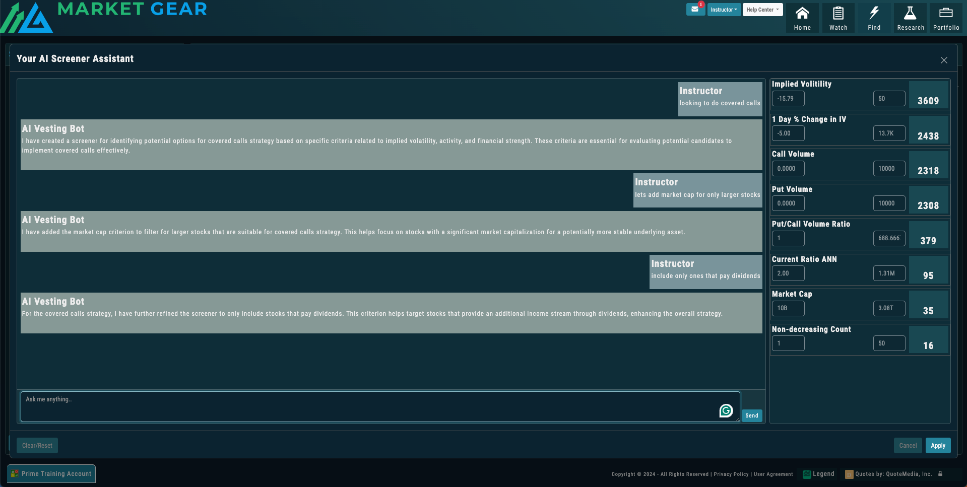 Market Gear allows you to sort from over 300 data points in stocks and options to find your trades. And now, using AI, you can have a back and forth conversation that narrows your scans to what you want without programming anything.