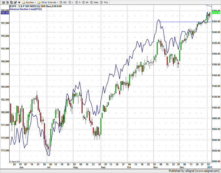 The cumulative NYSE A/D line is no longer leading price in the daily time frame. There is no divergence present, but the broad market doesn’t have the internal safety net that it enjoyed for the majority of the advance from July through December 2010.
