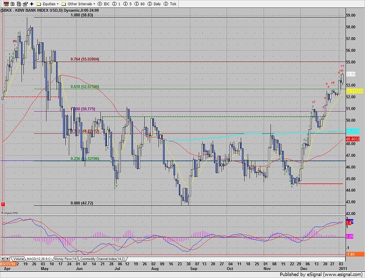 The BKX outperformed the broad market and is closing in on the next fib target. The seeker count is on day 11 of the 13 needed for an exhaustion signal.