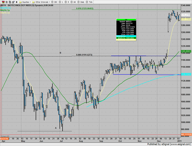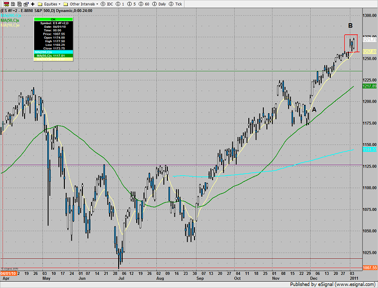 The January effect is a widely known phenomenon that proposes as goes January, so goes the rest of the year. It’s kind of a grand assumption, very long term in perspective, and its accuracy and usefulness is debatable. There is a much shorter time frame January phenomenon that is technically more potent. The current design of the broad market is one of a strong upward bias that has not had any corrective action since the beginning of the current impulse on December 1, 2010 (point A). Price has advanced approximately 75 points without any meaningful test of the bulls conviction to their long positions. This advance is often viewed as an extension of the seasonal December rally and leaves the pattern ripe for correction. The micro January effect goes as follows: When the preceding December has been upwardly biased and the first three days of the following January is up, more times than not, the bias will turn negative sometime on or after the fourth trading day of January.