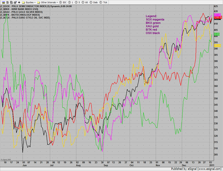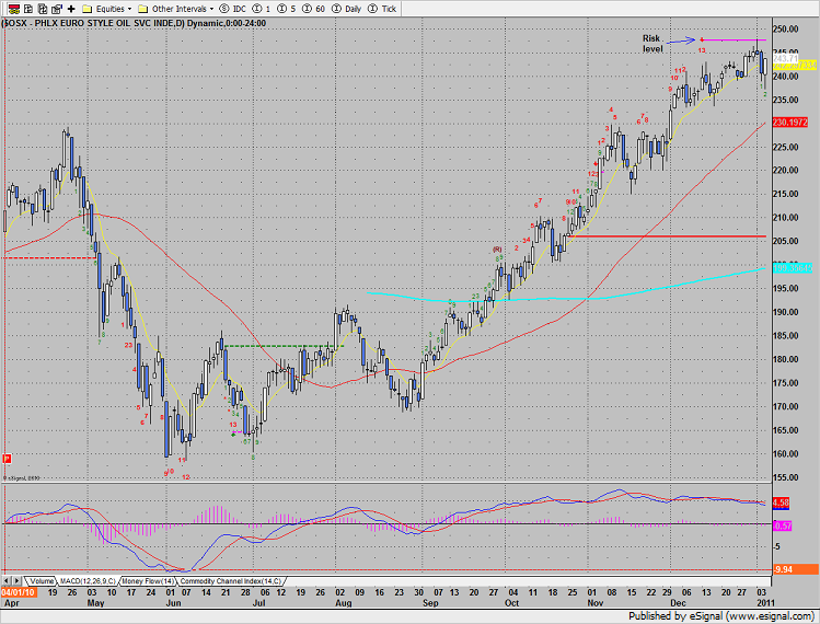 The OSX was higher by 3 on the day but is in the beginning of some corrective activity until the exhaustion signal risk level is exceeded.
