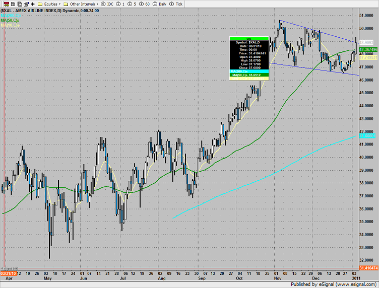 XAL was the top performing sector, settling right at the top of the falling wedge pattern. Overweight this sector for long ideas.