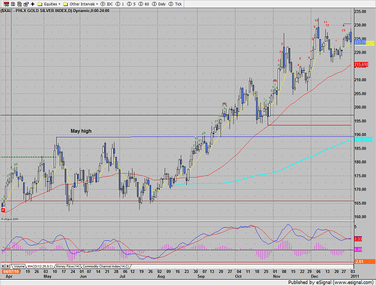 The XAU was the worst performing sector of the day. Monday’s price action left an outside day down candle on the chart. The Seeker exhaustion signal is still active.
